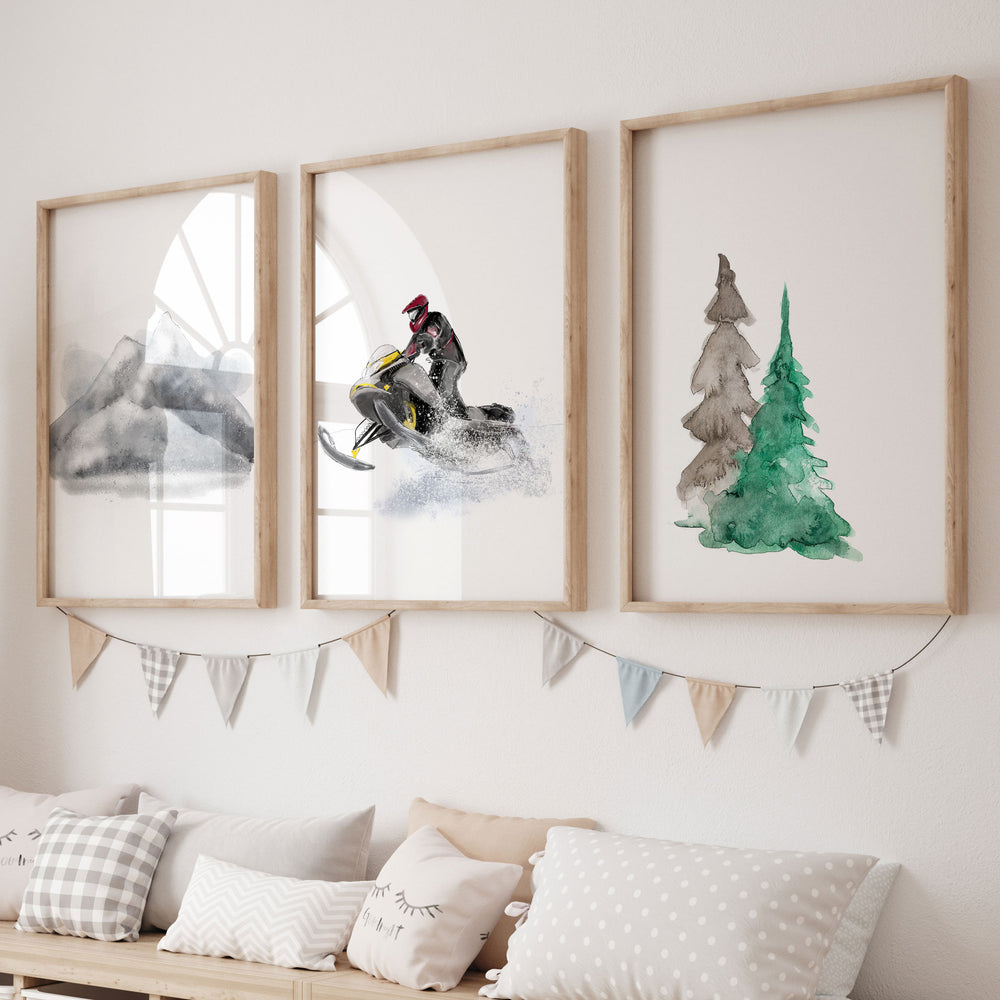 Ajoute une touche hivernale et d'aventure à la chambre de ton enfant avec cet ensemble d'affiches d'art authentique, inspirées par la nature et les sports d'hiver. Que ton enfant soit déjà fasciné par la motoneige ou que tu souhaites éveiller son esprit d'exploration, cet ensemble est parfait. Il inclut une illustration dynamique d'un motoneigiste en pleine action, des sapins majestueux, et des montagnes enneigées qui capturent l'essence de l'hiver et des grands espaces.